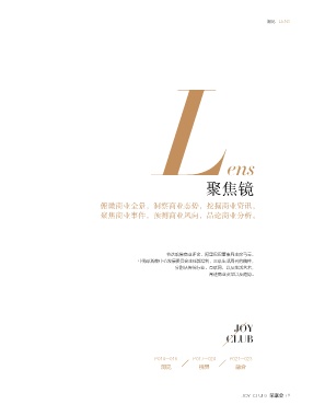 聚焦镜 洞见 Lens L ens 聚焦镜 俯瞰商业全景,洞察商业态势,挖掘商业资讯, 聚焦商业事件,预测商业风向,品论商业分析。 节选哈佛商业评论、阿里巴巴董事局主席马云、 中购联购物中心发展委员会主任郭增利,三联生活周刊的稿件, 分别从传统行业、互联网,以及生活艺术, 阐述商业变革以及趋势。 《清明上河图》局部 P010—016 P017—020 P021—023 洞见 视界 融合 8 荣享会 JOY CLUB JOY CLUB 荣享会 9